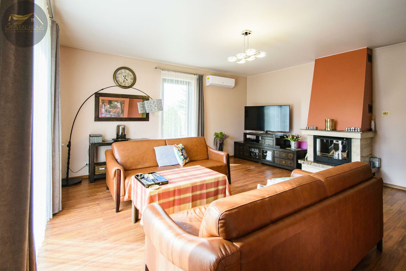 ogrzewanie gazowe, kominek z płaszczem wodnym, klimatyzację w salonie oraz ogrzewanie podłogowe w kluczowych pomieszczeniach (kuchnia, łazienka, hol, kotłownia i wiatrołap).